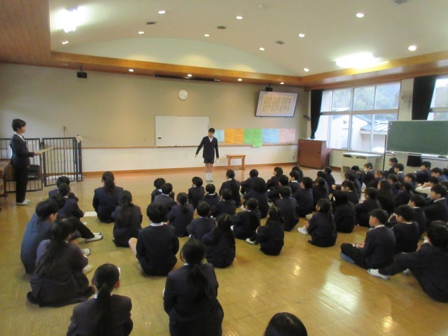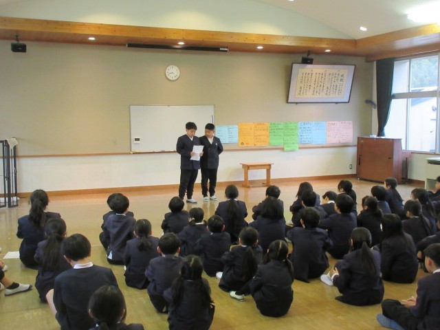 今朝は、全校朝の会でした。今年度最後の朝の会となりました。委員会より、3月の取組の説明などがありました。