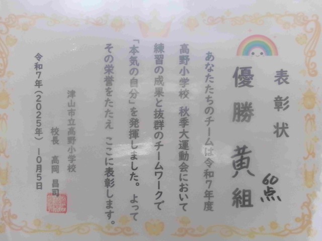あなたたちのチームは令和7年度 高野小学校 秋季大運動会において、 練習の成果と抜群のチームワークで「本気の自分」を発揮しました。 よって その栄誉をたたえここに表彰します。