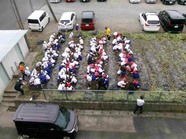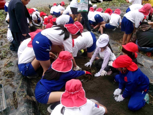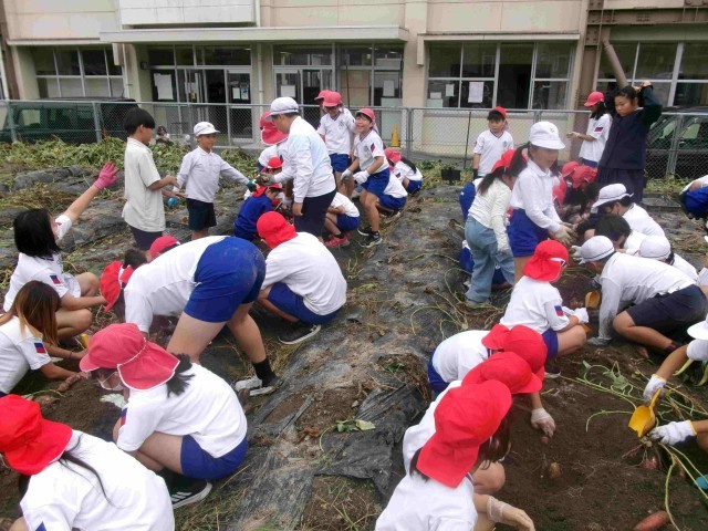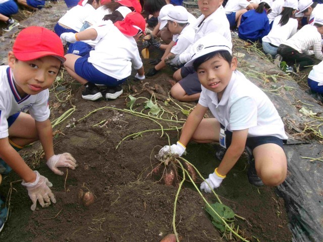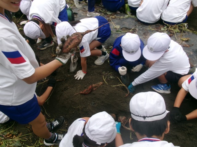 イモの種類は【安納芋】、とても甘くておいしいと評判のイモです。今年は昨年度以上の収穫を見込んでいます。本日は、先陣を切って、2・5年生のペア学年がイモ掘りをしました。かなり大きなお芋もとれました。