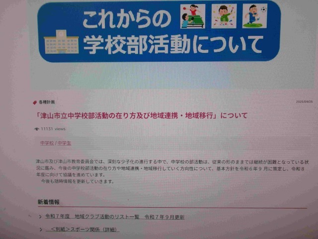 令和6年9月に策定した 「津山市立中学校部活動の在り方及び地域連携・地域移行の基本方針」に基づき、現在、学校部活動の在り方を見直しており、その中で、「学校部活動の精選と指導