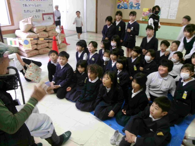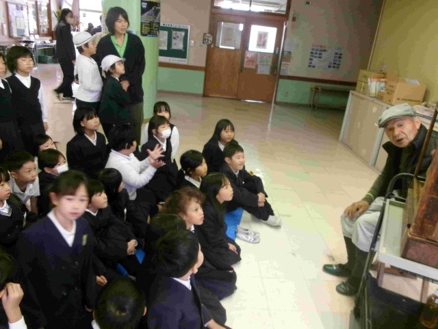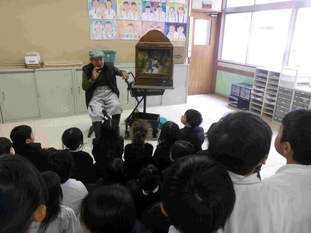 本日は、久しぶりに、「紙芝居おじさん」が参上してくださり、職員前フロアーにて、お昼休みの時間に、今、話題のクマの話を披露してくださいました。低学年を中心に、興味津々で紙芝居に聞き入る子どもたちがたくさんいました。今年は、特に、北海道や東北地方では、市街地や学校にまでクマが現れていることを知り、「こわいなあ~」、「背中をみせて逃げたらいけんのんじゃあ」、「津山にも出るん?」など子ども達からも様々な反応がありました。最後には、2メートルのヒグマのつめの模型を見せてくれ、その大きさに驚いていました。20分間でしたが、「紙芝居おじさん」ワールドを子どもたちもすっかりと入り込んで楽しんでいました。