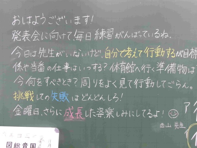 今週11日、登校してくる子どもたちを迎えるように、校舎に虹がかかっていました。5年2組の教室を覗くと、今晩に出張にでた主担任から「愛のメッセージ」が黒板に書かれていました。4年生を覗くと、グループで集まってリコーダーの練習を自分たちで行っていました。15日の学習発表会に向けて、どの学年も追い込みをかけています。その頑張りを虹がやさしく見守ってくれています。先生たちの心からの思いが溢れています。