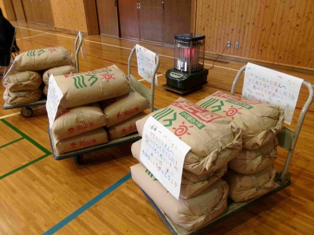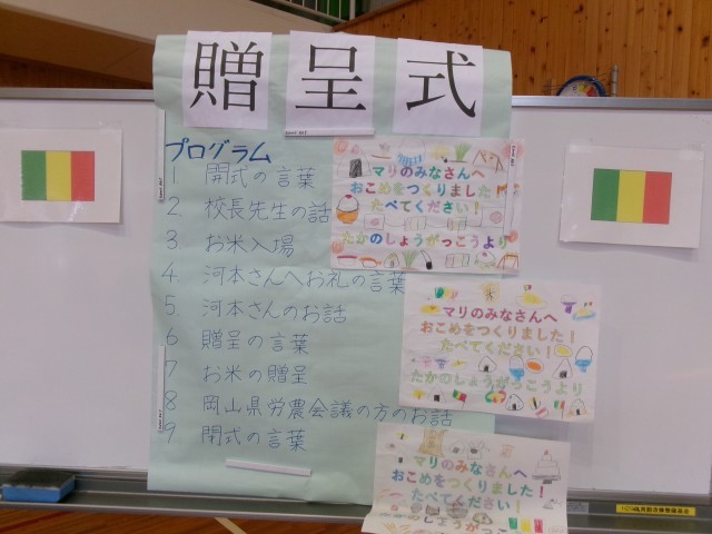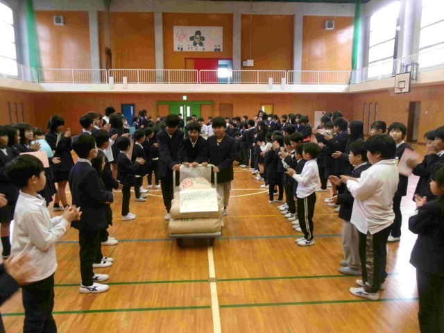 本日、マリ共和国に米を送る贈呈式が開かれ、児童が米作りに関わった約8俵(約480㎏)を労農会議の方へ贈呈しました。今後、NGO団体等を通じて現地に届けられる予定のようです。
