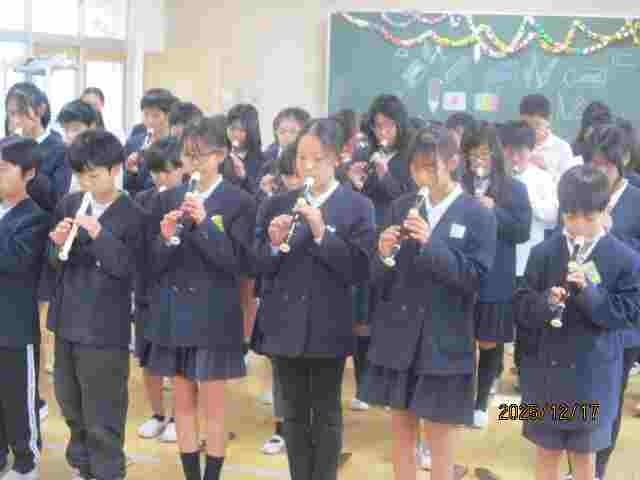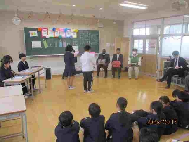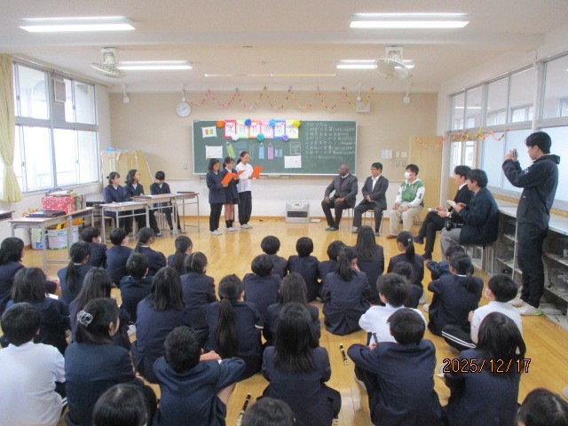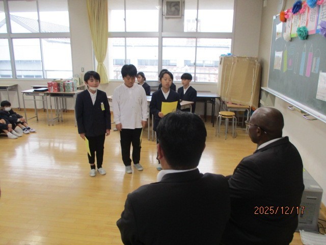 5年生は、10月のマリ共和国からの留学生とも、話を聞くだけでなく日本の生活や文化をプレゼンで伝えたり、日本の遊びを一緒にするなどのアイデアを積極的に出して取り組んでいました。今回の文房具の贈呈式も、あまり準備の日はありませんでしたが、子ども達が会の内容を考え、役割分担をして、意欲的に取り組んでいました。学習発表会でのリコーダー合奏や歌も披露するなど工夫した贈呈式を行いました。