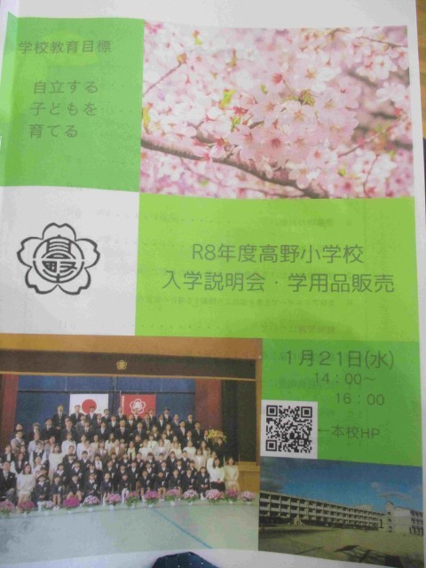 校長挨拶、1年団より小学校入学にむけて、高野小学校のきまり等について、準備物について、保健室から、アレルギー・除去食について、給食費・PTA会費・就学援助について、諸連絡、教育相談、学用品販売と多くの連絡等を行いました。