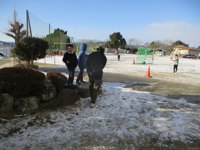 大寒波到来で、朝は冷え込みました。小学校のグラウンドもうっすら雪が積もり、雪景色でした。