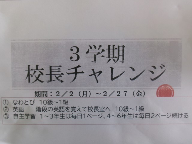 「本気でやれば、たいていのことはできる。本気でやれば、何でも楽しい。本気でやれば、誰かが助けてくれる。」本気の姿を、授業や運動、生活面で期待しています。本気の2月を頑張ります!