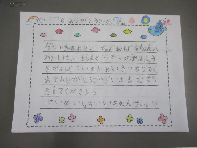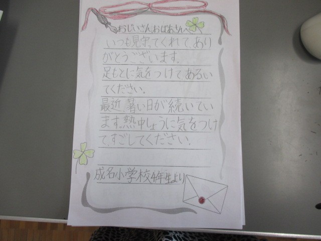 昨日は敬老の日。成名地区の老人クラブ連合大会も成名公民館で行われました。成名っ子からは毎年、地域のお年寄りの皆さんへお手紙を書いて届けています。かな文字を習ったばかりの1年生から最高学年の6年生まで全校児童が敬老の日に寄せる気持ちを手紙に書きました。一部の学年のお手紙を紹介します。また、昨日は成名小学校の創立記念日でもあり、148歳になりました。歴史と伝統のある成名小学校が更により良い学校になるよう、子どもたちと共に精進して参ります。