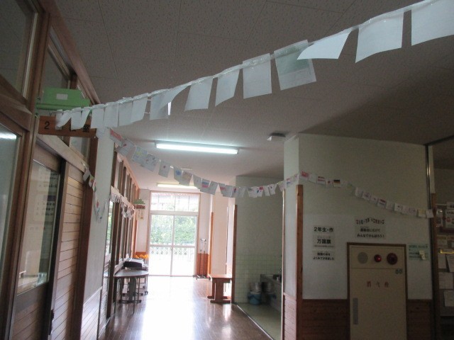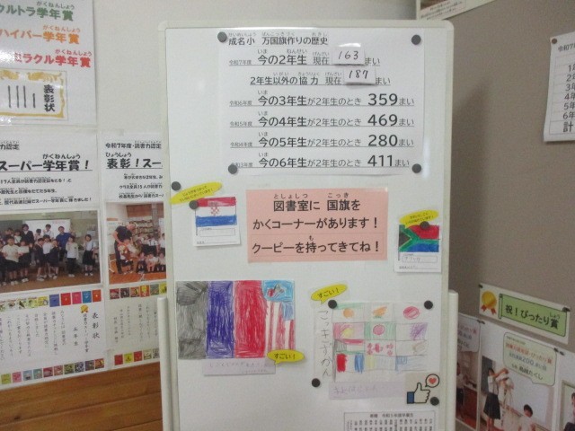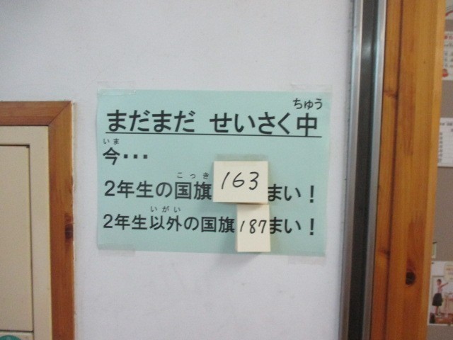 9月27日(土)の本番に向け、校舎内のあちらこちらに運動会を盛り上げる掲示ができてきています。運動会と言えば万国旗。2年生を中心にたくさんの万国旗を子どもたちが描いてくれています。歴代の数を図書の先生が記録に残していました。今年度の合言葉「もっと挑戦」のもと新記録達成に向けて、2年生以外の学年も楽しみながら協力してくれています。さあ、令和7年度は何枚の国旗が飾られるでしょうか。学校にお越しの際はぜひご覧ください。
