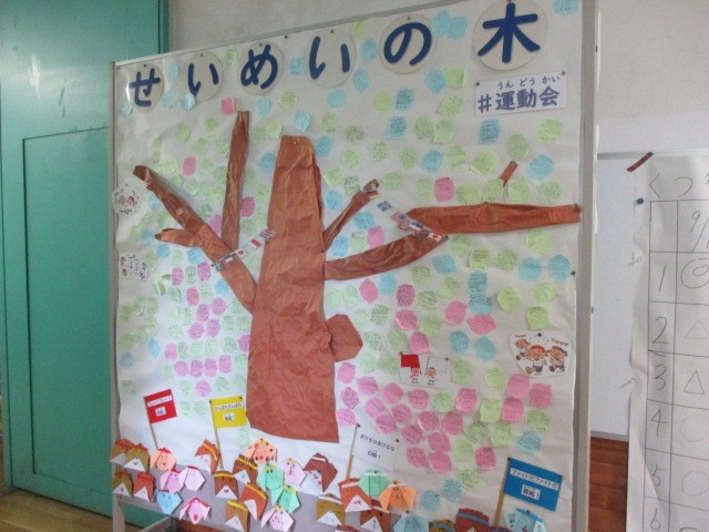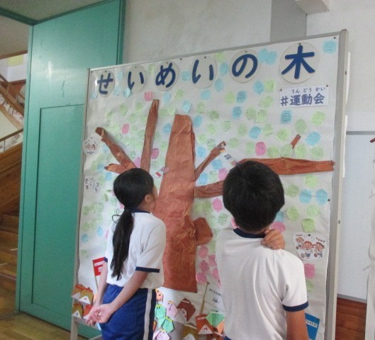 また、運動会練習で見つけたお友だちのよいところやがんばっているところが書かれた「せいめいの木」の葉がたくさん茂り、大きくなってきました。同級生のがんばりや先輩のすごいところなどがいっぱい書かれています。本番まであと明日1日を残すのみとなりました。少し体が疲れているお子様もいます。早寝・早起き・朝ごはんで体調を整えて、27日(土)には元気に参加できるようにと願っています。