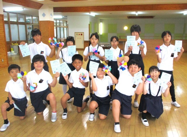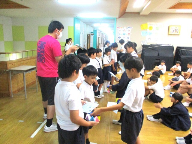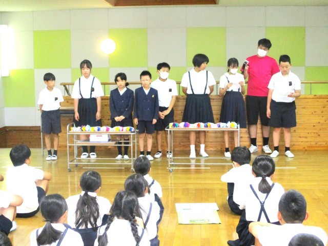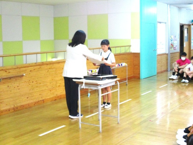 最後に、夏休みの課題で全校が取り組んだ読書カード「この夏☆出会った1さつ」の中から、図書委員さんが選んだ「この夏キラキラブック賞」に選ばれた各学年2名ずつの発表があり、スペシャルクーポン券と図書委員さん作の万華鏡が贈られました。周りのお友だちからも大きな拍手が贈られました。
