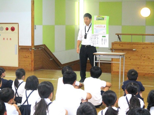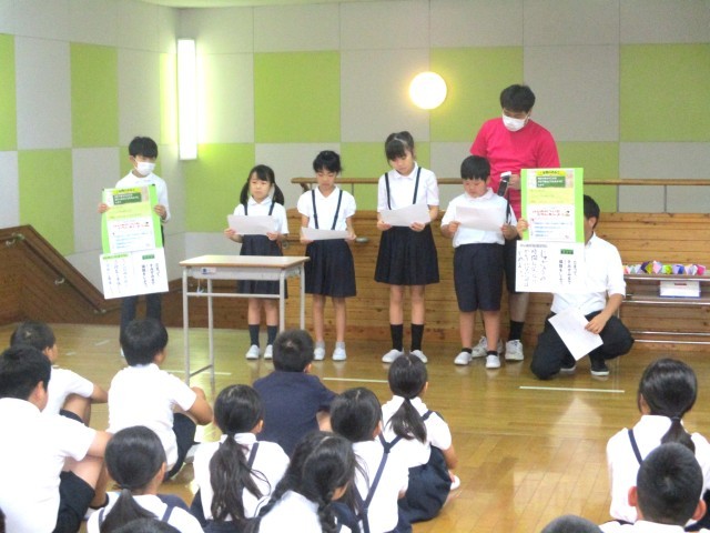 3年生が9月の月目標の反省を発表してくれ、今月の目標についてがんばることを6年生が発表してくれました。また、今月の担当の先生からは「けじめのあるくらしをしよう」についてのお話がありました。