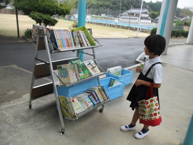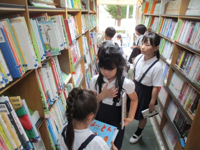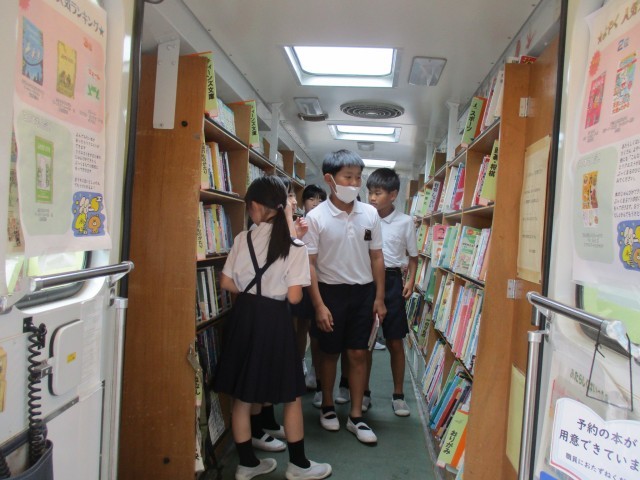 20分休みには、ぶっくまるがやってきました。読みたい本を見つけに多くの児童が移動図書館を訪れていました。