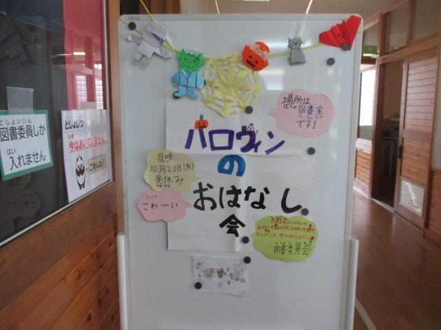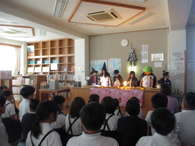今日はお昼休みに、普段と全く違うハロウィン仕様に飾られた図書室に子どもたちが大勢集まり、図書委員児童作の「こわいおはなし」2本を図書委員会の子どもたちが読み語ってくれました。
