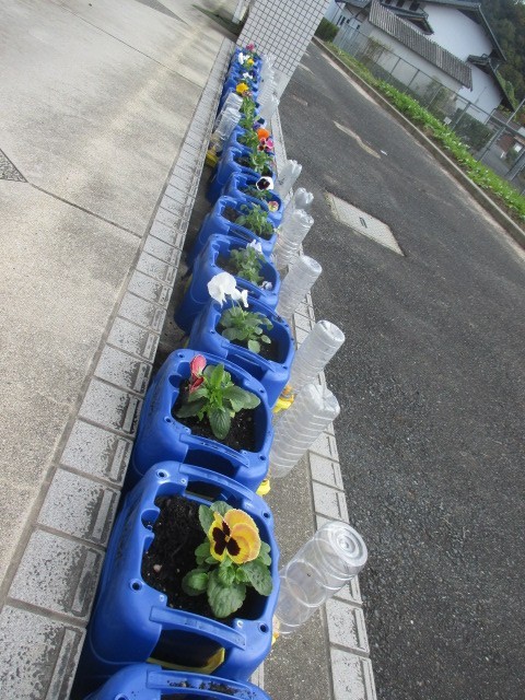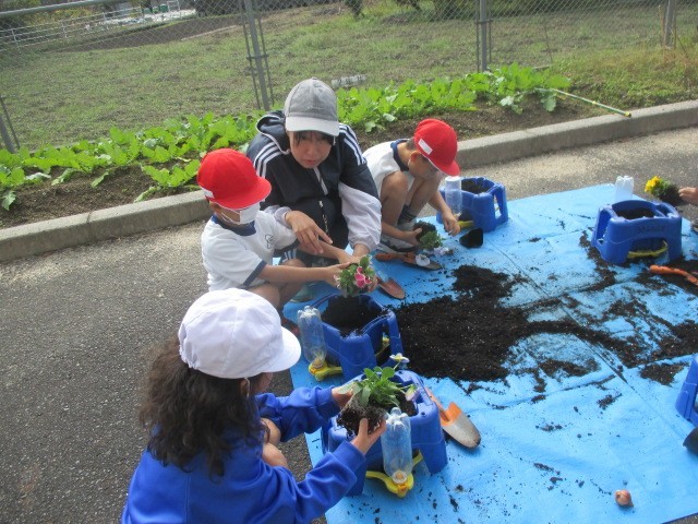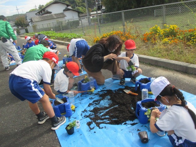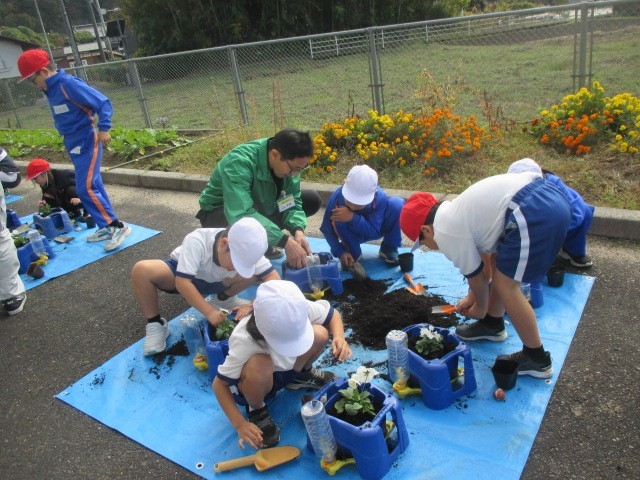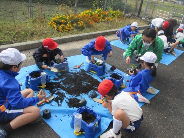 また、今日は3校時目に1年生がホームセンターナンバより3名の方を外部講師としてお招きし、「幸せのたねプロジェクト2025園芸教室」を行いました。アサガオを育てる学習が終わった後の鉢に、チューリップの球根とパンジーの苗を植えるお勉強をし、その後テラス横で実際にお友だちと協力しながら、また、講師の先生に助けて頂きながら、上手に植えることができました。4月、2年生に進級するころには何色のチューリップが咲くでしょうか。また、卒業式や修了式の頃には綺麗なパンジーが咲き誇っていることでしょう。ナンバの皆様、大変お世話になりました。