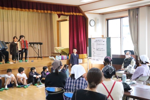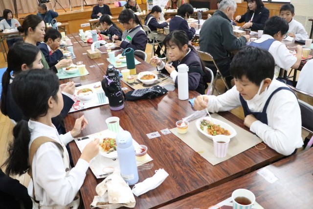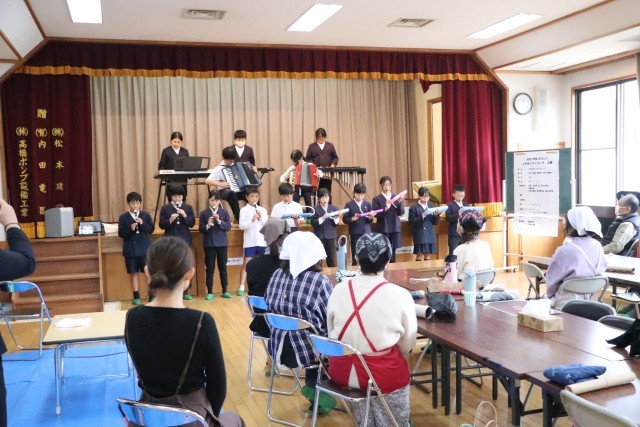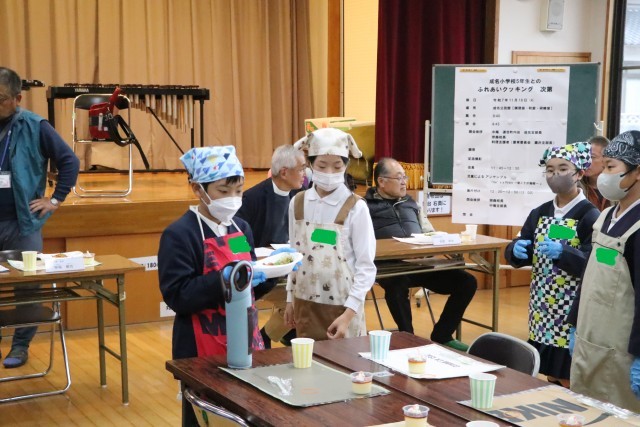 昨日は、5年生が学校運営協議会委員や愛育委員の皆様、地域の皆様、社会福祉協議会の方々と一緒に成名公民館において、ふれあいクッキングを行いました。今年で3回目になるふれあいクッキングですが、毎年5年生が昼食づくりを通してふれあいの時間を持たせていただいています。今年度は、ハヤシライスとおひたし、そしてデザートとしてプリンを作り、みんなで美味しくお腹いっぱい頂きました。地域のみなさんとたくさんお話をしながら交流を深めることも目標の一つとして取り組んだ子どもたち。料理するとき、食べるとき、後片付けのとき等、さまざまな場面で会話ができていました。会の終わりには、学習発表会の合奏曲を演奏し、お礼の気持ちを伝えることができました。愛育委員の皆様には計画や準備、片付け等々、数々お世話になりました。ありがとうございました。5年生の子どもたちは大満足の半日でした。
