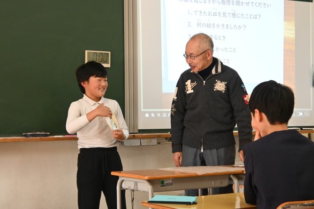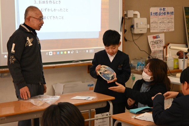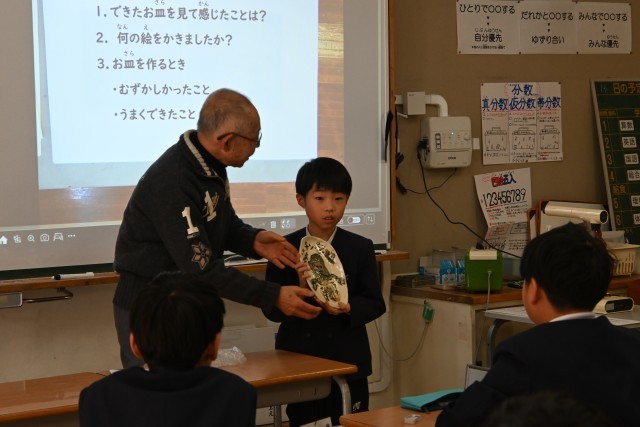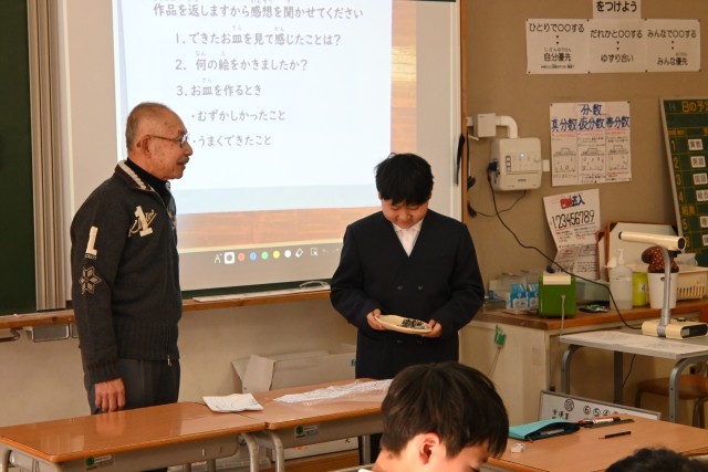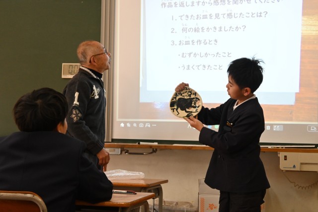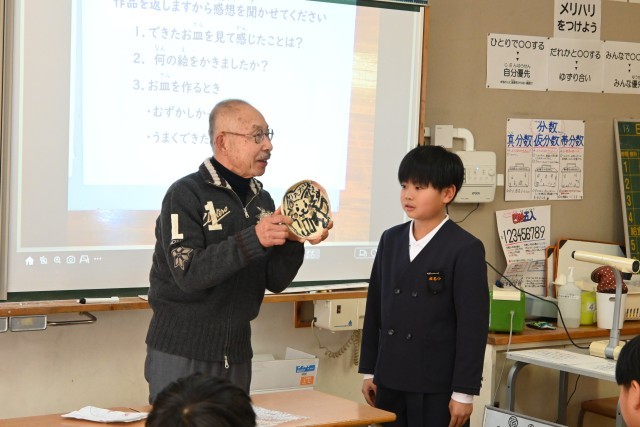 まず初めに焼き物についてのお話をしていただき、焼き物の種類や焼き方などの知識を、社会科で学習したことと関連付けながら真剣に聞いていた子どもたち。続いていよいよ作品の受け取りでは、一人ずつ順番に受け取り「おおー!」「すご!」「うま!」と温かい反応がありました。「初めより縮んでるー!」「思ったよりうまく描けた!」とそれぞれに感想も述べていました。世界に一つだけの素敵なお皿、二分の一成人(今は18歳で成人ですが・・・)のお祝いの品としていつまでも大切にしてもらえたらと思います。奥田様にはいろいろとお世話になり、ありがとうございました。