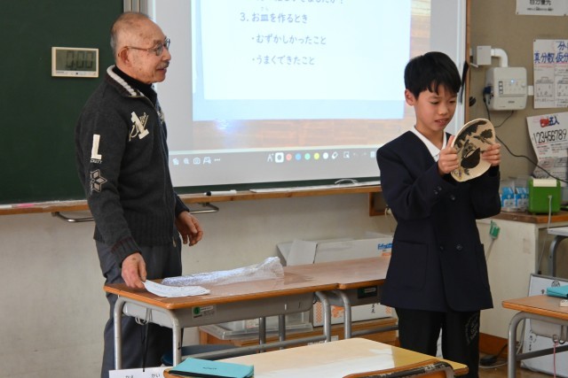 今日の4校時目は、4年生にとっては待ち遠しくとても嬉しい時間となりました。2学期の終わりに行った陶芸体験で形成した絵皿が焼き上がり、奥田様に届けていただいたのです。