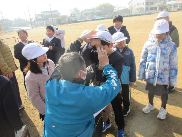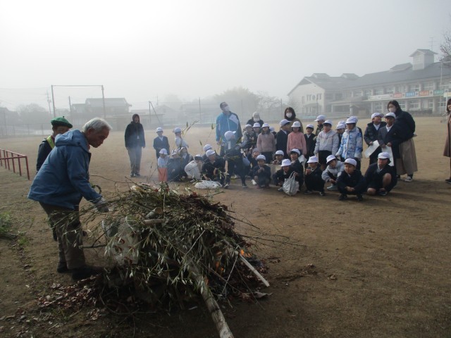 本日3校時目に、1・2年生がとんどをしました。学校支援ボランティアの吉村様ご夫妻にお世話になり、今年も行うことができました。お家から正月飾りを持ってきた児童は火の中に入れ、燃え上がる炎やけむりに乗って歳神様が天へ帰るのをみんなで見送ることができました。また、がんばって書いた書き初めを炎の中へ置くと高く舞い上がり、きっと字が上達することまちがいなし。最後には、今年1年も無病息災、元気に過ごすことができますようにと、出来た炭を先生たちにおでこに塗ってもらいました。吉村様、準備から後片付けまで大変お世話になり、ありがとうございました。とっても楽しいとんどができました。