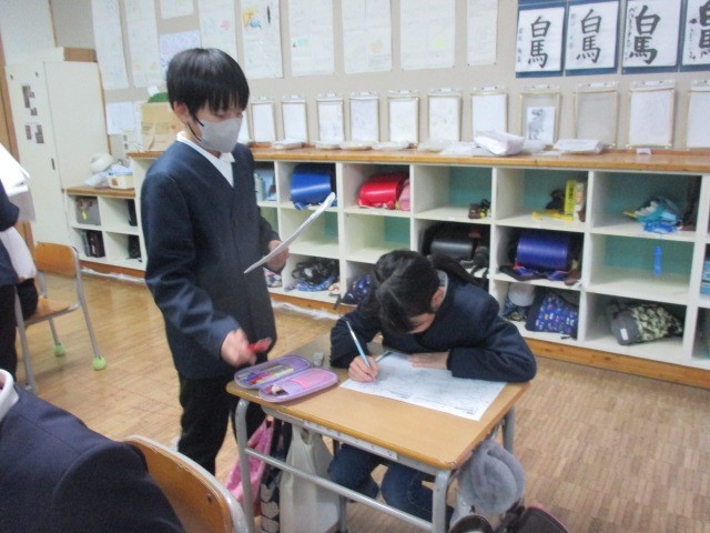 水曜日の放課後は算数の補充学習「せせらぎタイム」です。今日は特別に、先輩に教わる時間を設けました。6年生は4年生に、5年生は3年生に、算数のプリントを使って、下学年が解くのを見守ったり、分からないときには解き方を伝授したりして、あっという間の15分が過ぎていきました。5・6年生は今日の問題をあらかじめ解き、万全の体制で臨みました。3・4年生の子どもたちもお兄さん、お姉さんに教えてもらえるとあって、張り切ってどんどん問題にチャレンジしていました。両学年ともとっても良い表情で温かい時間となりました。