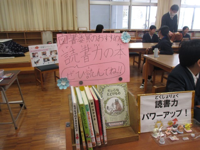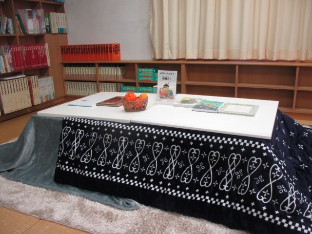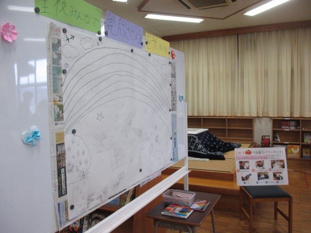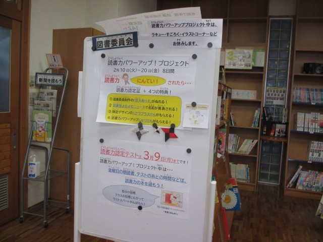また、今日からは図書委員会による読書力パワーアッププロジェクトが2月20日(金)までの期間、開催されます。本年度も読書に力を注いできた成名小学校ですが、最後の最後まで全校で頑張ろう!、自分の目標やクラスの目標を達成させるべく、もうひと踏ん張りしよう!ということで取り組みます。この期間は図書委員さんが考えてくれた特典も満載ですし、図書室の畳コーナーには読書力の本をあったかく読むためのこたつも登場し、また、机の配置も普段とはガラリと雰囲気を変え、プロジェクトモードになっていました。雪解けでグラウンドで遊べない日も多いので、ラストスパート、この期間に是非読書力の本に多くの人がチャレンジしてほしいと思います。