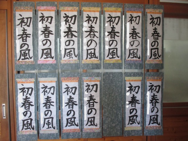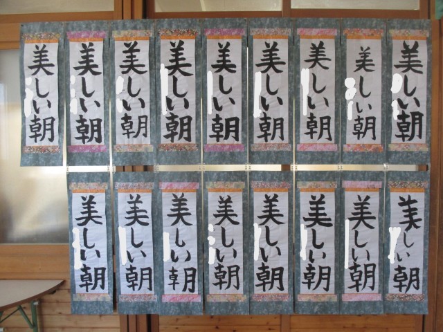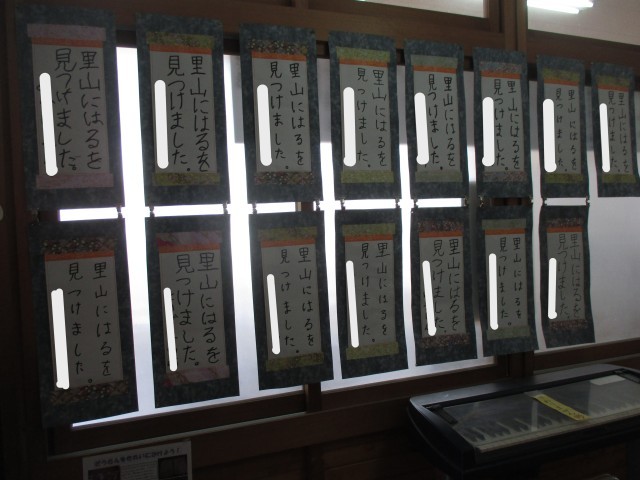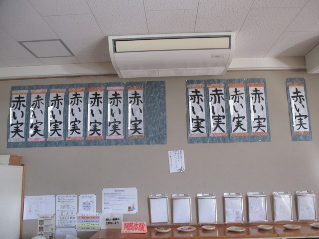 さて、2学期末から書き始めたお習字の作品を校内に掲示しています。1・2年生はフェルトペンで、3年生以上は毛筆で長半紙に書きました。今日はみんなの作品をみていていただきたいと思います。一人ひとり、違った味のある、素晴らしい作品が並んでいます。