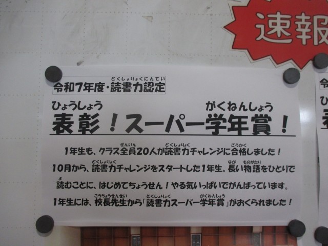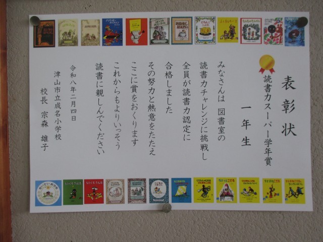 先週金曜日が最終日だった読書力パワーアップ!プロジェクト。多くの児童が読書力の本にチャレンジし、大盛会のうちに終わりました。そして、2学期から読書力チャレンジをスタートさせた1年生が、2月4日にクラスの全員が読書力認定され、めでたく読書力スーパー学年賞を受賞していたのですが、インフルエンザや学年閉鎖等の関係で学級の全員がなかなか揃うことができず、授与することができていなかったのですが、やっと先週金曜日に賞状を渡すことができ、みんなで記念撮影をしました。読書大好き1年生、これからもどんどん読書力の本に挑戦してくれることと思います。