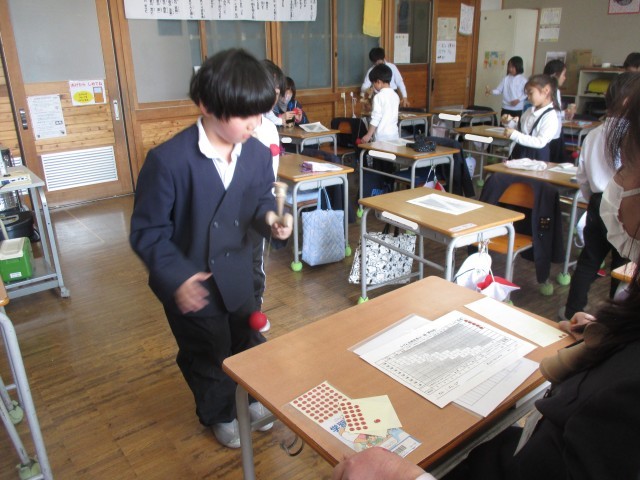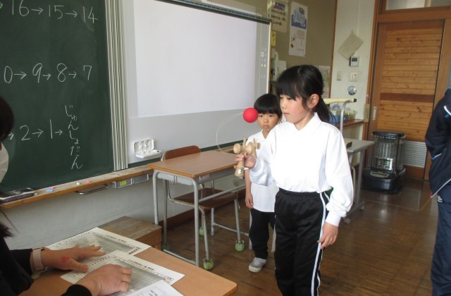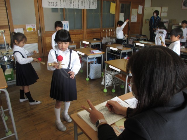 また、4校時目には、けん玉検定を行い、けん玉道の1年間の取組の成果を確認することができました。検定の順番が来るまでも本気で練習し、今まで出来なかった技が出来るようになった人もいました。粘り強く繰り返しチャレンジすることで、あきらめない気持ちや出来た時の達成感を味わうことができるけん玉。2週間後から始まる春休みにもどんどん挑戦してほしいと思います。