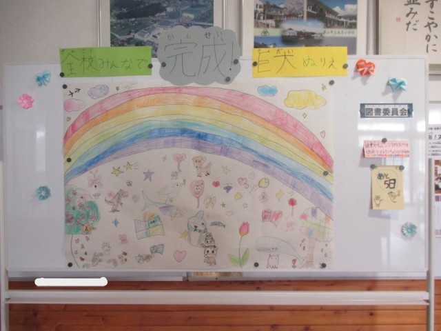 最後の写真は、先月行われた読書力パワーアップ!プロジェクトのイベントのなかのひとつとしてみんなで取り組んだ巨大ぬりえの写真です。きれいに色づけされて完成し、児童玄関に飾られています。