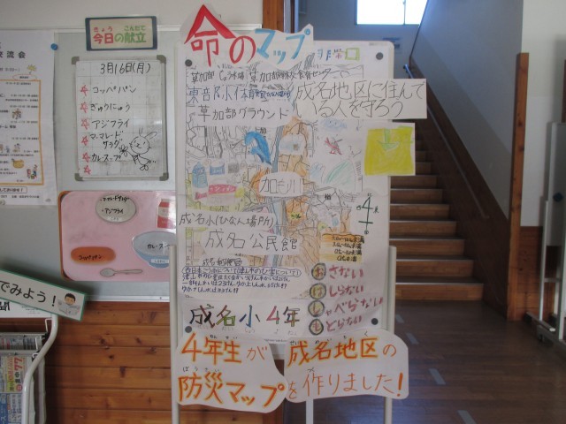 児童玄関のところに、4年生が書写の学習で制作した防災マップが飾られています。理科の学習のまとめかな?それとも社会のまとめかな?と思っていたら、書写の学習でポスターの共同制作を行ったそうです。一文字一文字がとても丁寧で、見た人がとても見やすく分かりやすいマップが完成しています。この調子で、ノートでもプリントでも、どんな物にでも、いつも丁寧に文字を書くことを習慣づけてほしいと思います。