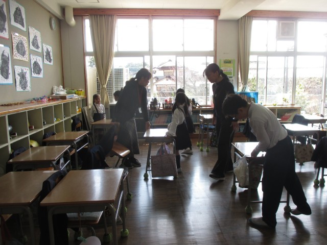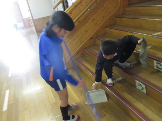 楽しい昼休みの後は、10分間のお掃除の時間です。1年間縦割り班掃除を中心に行ってきましたが、リーダーとなる6年生がいないため、今は学級ごとの掃除になっています。教室や廊下、下駄箱等をお友だちと協力しながら、一生懸命に掃除している姿がたくさんありました。来週には1年間お世話になった教室を綺麗にして次の学年に渡すことができるよう、大掃除も行います。
