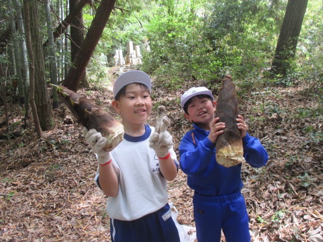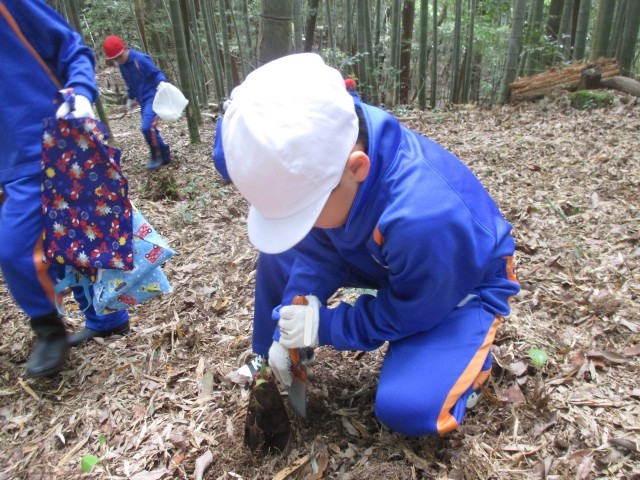 移植ごてを使って周りの土をどかしながら掘り進め、最後はボランティアの方に掘り起こしてもらい、大物をGet!!お友だちと協力して楽しく掘る様子も見られ、また、取れたたけのこを誇らしげに見せてくれました。