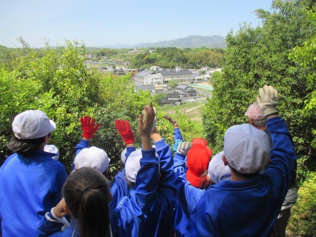 また、頂上までみんなで登ると、我が成名校が見下ろせ、2年生みんなで学校に向かって「ヤッホー!!」と何度も大きな声で叫ぶと、気が付いて下さった職員室にいる先生たちが出て来て大きく手を振ってくれました。子どもたちは大喜びでこちらからも手を振り返し、2年生みんなの笑顔がはじけていました。
