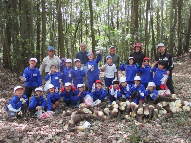 最後にボランティアの皆さんと、たくさん掘れたたけのこと一緒に記念撮影をして、帰校しました。