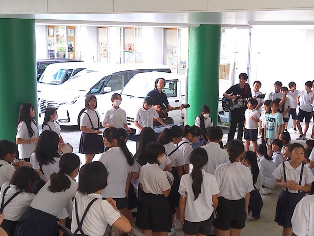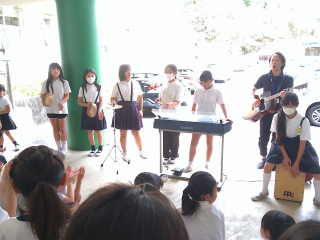 今回はメドレーで、中国ダンス、青と夏、むげん城(ナルト)、鬼滅の刃の炭次郎の歌、ライラック、あかざを披露してくれました。聴いている子どもたちもノリノリでダンスをしたり、手拍子をしたりして楽しんでいました。