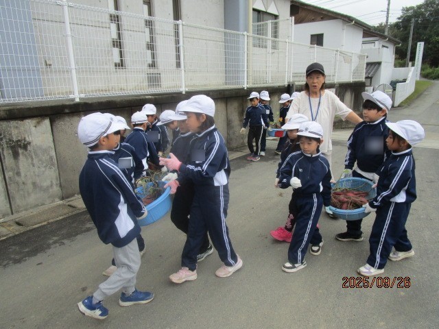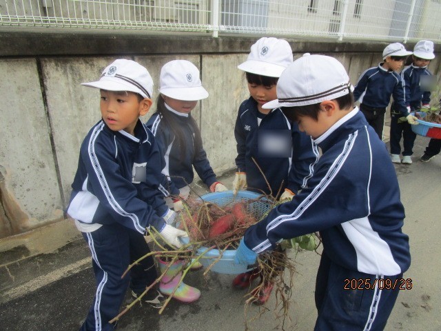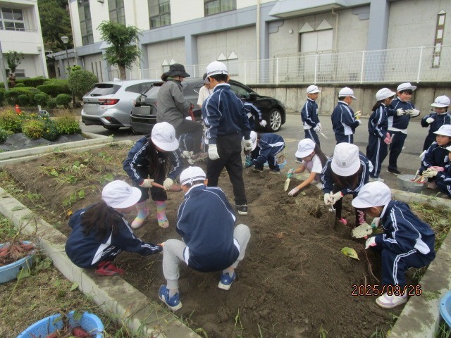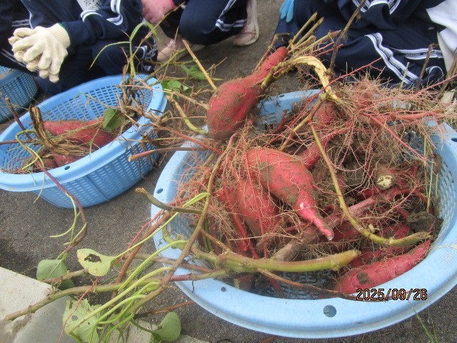 学級園で育てていたサツマイモを友だちと一緒に一生懸命にほりました。土の中から少しずつ見えてくるいもに「わー!」{あったよ。」と声をあげながらみんなでなかよくほりました。ほったおいもは、みんなで協力して教室まで運びました。
