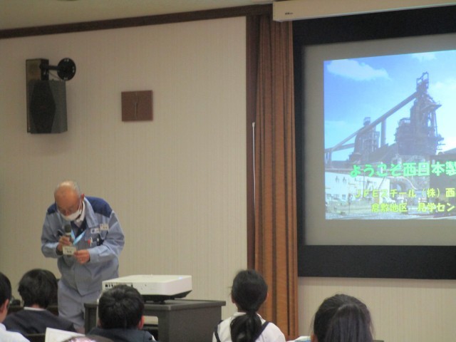 お弁当を食べた後は、製鉄所の見学です。説明を聞いた後でバスで広い製鉄所の中を見学しました。途中はバスを降りて、圧延工場の中に入って見学通路から実際に鉄の塊から鉄板ができていく様子を間近に見ることができ、その迫力と規模の大きさを実感できたと思います。