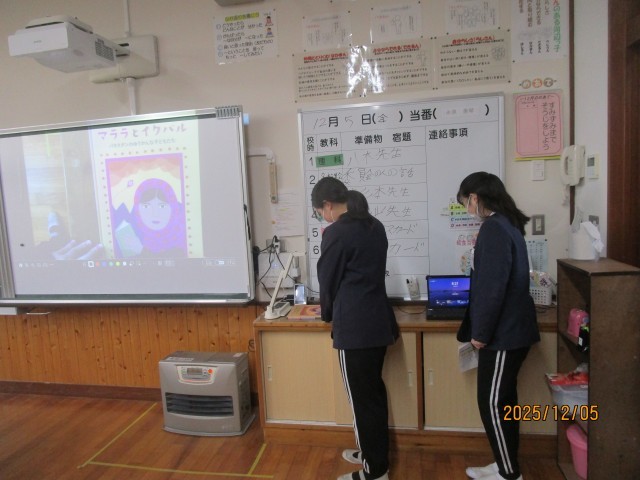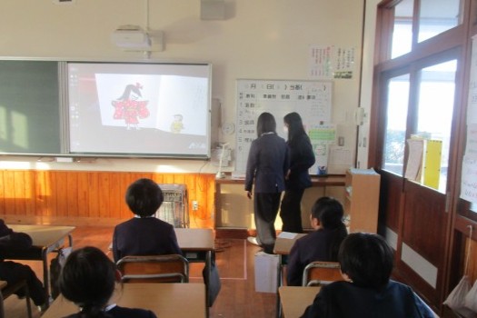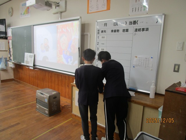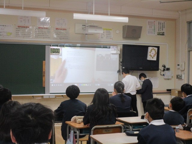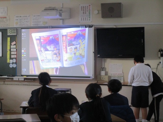 3年生から6年生の各教室に図書委員会の5・6年生が行き、プロジェクターで本をスクリーンへ映して読み聞かせをしました。