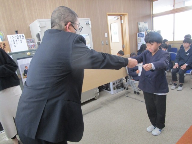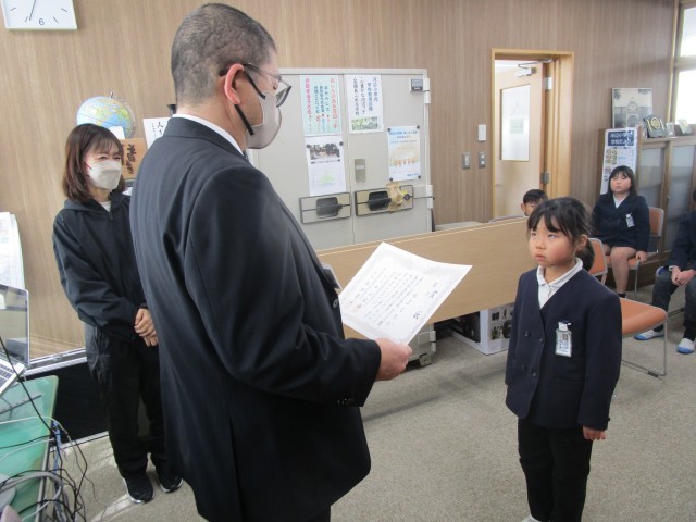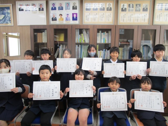 12月18日(木)に校長室で児童生徒書画展の表彰を行いました。