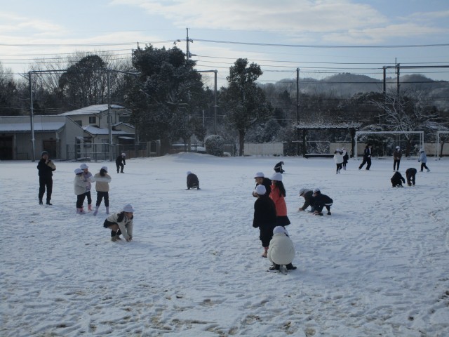 1時間目に1年生と2年生は生活科で「冬のくらし」の学習として運動場に出て雪遊びをしました。子どもたちは真っ白な雪が一面に積もったグラウンドに「やったー!」と歓声をあげて元気に飛び出していきました。雪をさわったり、雪を丸めたり、雪合戦をしたり、雪の上を思いっきり走り回ったり、友だちと一緒に楽しい時間を過ごしました。子どもたちはみんな笑顔で一面真っ白な運動場を全部使って楽しんでいました。