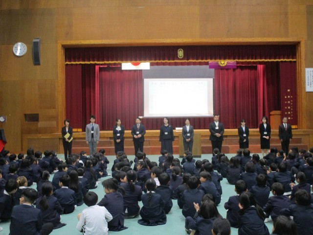 着任式で、新しく河辺小学校に来られた先生方10人を紹介し、あいさつをしていただきました。