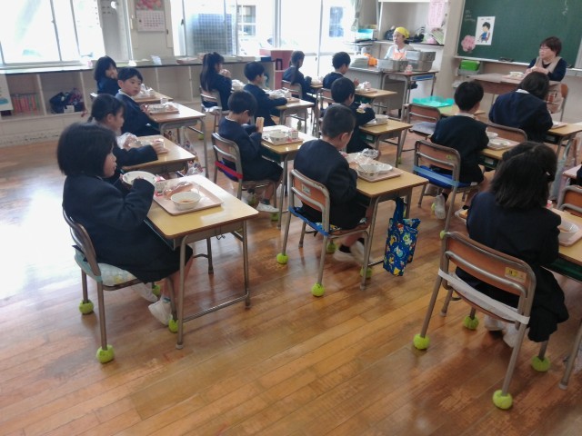 1年生にとっては、小学校ではじめての給食です。給食当番も上手にできて、みんなでおいしく食べることができていました。1年生の教室で、「小学校の給食はどう?」と尋ねてみると、「おいしい!」「とってもおいしいよ!」と言う声がたくさん返ってきました。