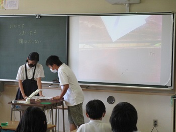 平和委員会の呼びかけで、今日はみんなで鶴を折りました。本来は、6年生が広島の修学旅行へ行く際に、平和公園に収めるために折っていました。けれども、コロナのために広島へは行けなくなったので、学区内にある公民館や老人介護施設などに届けるようにしています。平和委員が各教室に行って、折り方を教えてくれたり、6年生やお友達のアドバイスがあったりで、みんなちゃんと鶴を折れました。折った鶴は、6年生が糸に通して束にしてくれます。