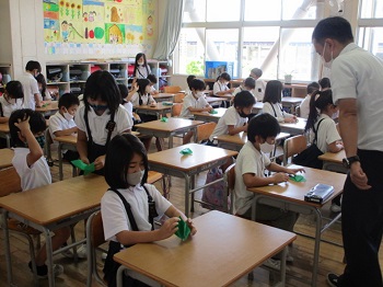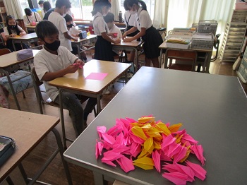 平和委員会の呼びかけで、今日はみんなで鶴を折りました。本来は、6年生が広島の修学旅行へ行く際に、平和公園に収めるために折っていました。けれども、コロナのために広島へは行けなくなったので、学区内にある公民館や老人介護施設などに届けるようにしています。平和委員が各教室に行って、折り方を教えてくれたり、6年生やお友達のアドバイスがあったりで、みんなちゃんと鶴を折れました。折った鶴は、6年生が糸に通して束にしてくれます。