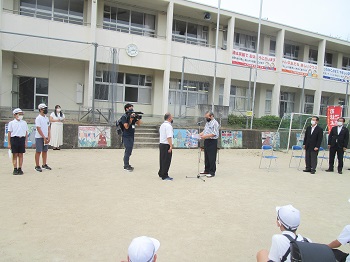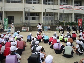 先日紹介しました横断幕とあいさつ運動ののぼりの贈呈式を行いました。今回の横断幕とのぼりは、学区の企業3社様と連合町内会河辺支部様から、ご寄付していただきました。みんなで、あいさつ運動を広げ、河辺小学校を仲良く楽しい学校にするための応援をしていただきました。連合町内会坂本支部長から目録をいただき、児童代表がお礼の言葉をお伝えしました。その後の一斉下校では、子どもたちがお客さまに気持ちの良いあいさつを言いながら下校しました。