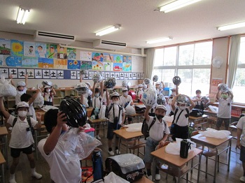 ヘルメットをもらいました! 公開日 2021/09/15 更新日 2021/09/15 お知らせ 9月15日(水) 3年生になると、PTAからヘルメットが全員にもらえます。1学期に注文をしたものが届き、今日子どもたちに配りました。とてもうれしそうです。これから自転車に乗るときには、必ずこのかっこいいヘルメットをかぶって、安全運転しましょう。