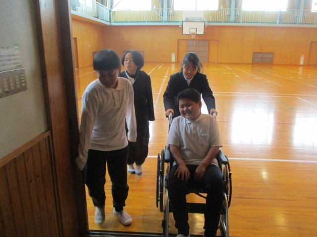 1月23日(金)5・6時間目に車いす利用者の髙橋修二さん、社会福祉協議会の黒田さん、岡﨑さんに来ていただいて、「車いすの使い方・車いす利用者の思い」などについて学習しました。実際に乗ったり介助してみたりして、車いす利用者の困り感について考えることができました。もし、困っている人に出会ったら声かけしたい思うことができました。