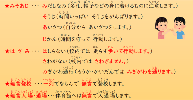 保護者や地域の方々も、この「きまり」について褒めたり、励ましたりするお声かけをどうぞよろしくお願いします。