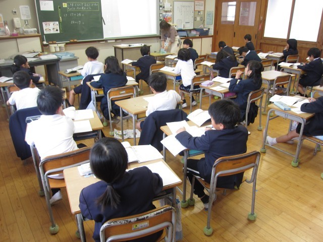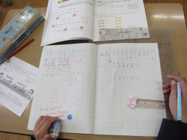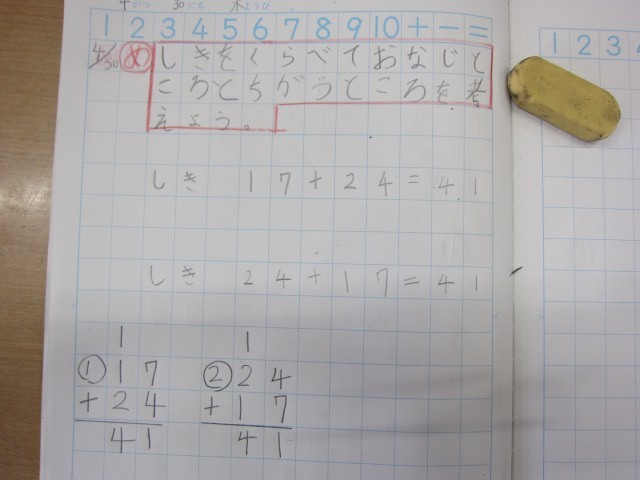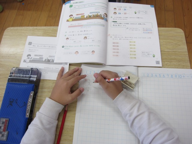 授業の様子(2年生) 公開日 2026/04/30 更新日 2026/04/30 お知らせ 2年生の教室では、算数(2ケタ+2ケタ)の学びをしていました。 (横式)17+24=□□ の横式から、筆算に書き換える活動が大切です。 (筆算) 17 +24 □□ものさしを使って線を引き、繰り上げもしながら計算をしていきます。子どもたちが苦手なところでありますので、ご家庭でも点検をよろしくお願いします。 +2