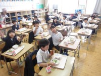 今日の給食は、入学・進級祝い献立です。ご飯とよく合う鶏肉の照り焼き、すます汁には...
